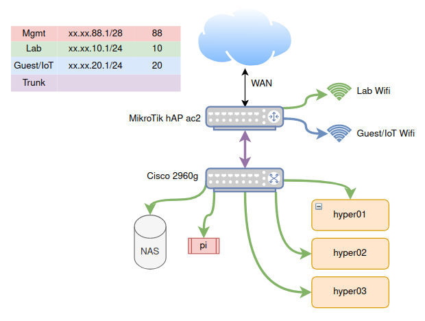 In the previous post, we introduced the beginnings of the makings of a homelab and the hardware I’ll been using for it. In this post, I will be going over the networking I’ve setup to have all pieces talking to each other in a safe and secure way. This networking scheme is simple, and will most likely evolve as I add more services on my hypervisors. Here’s what it looks like: