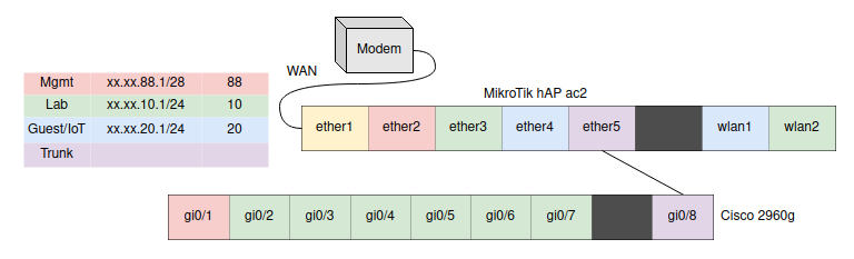 In the diagram above, you’ll see that the Cisco 2960g switch has multiple machines attached to it, all on the Lab network. I could just as well set an additional port to be on the Guest VLAN, and then any machine connected to this port would not be able to communicate with the Lab network.